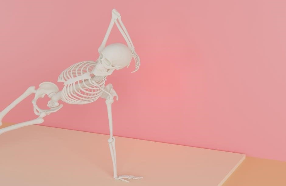 The axial skeleton forms the body’s central framework, comprising the skull, vertebral column, ribs, and sternum. It provides support, protects vital organs, and serves as an attachment point for muscles. The appendicular skeleton includes the upper and lower limbs and the pelvis, enabling movement, locomotion, and manipulation of objects. The axial skeleton is divided into 80 bones, with the vertebral column forming a flexible yet sturdy structure. The appendicular skeleton contains 126 bones, with long bones like the femur and humerus supporting body weight and facilitating movement. Together, these systems create a balanced structure for mobility and stability. Lab manuals often use detailed diagrams to illustrate these skeletons, highlighting their anatomical differences and functional roles. Visualizing these systems helps students understand how bones contribute to overall body mechanics and physiological processes. This visual approach enhances comprehension of skeletal anatomy and its dynamic interplay in human movement and posture.